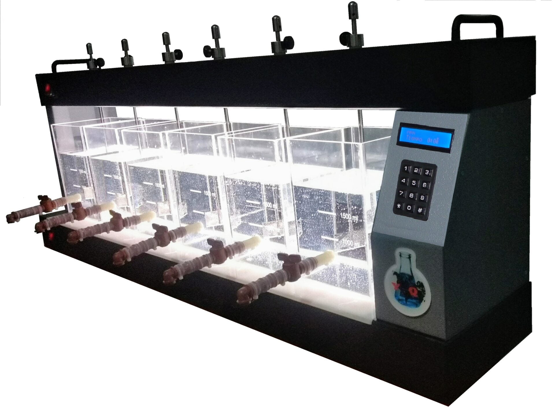 El floculador de seis puestos lineal es un sistema ideal para mediciones en laboratorio eficiente ocupa poco espacio y tiene poco peso.